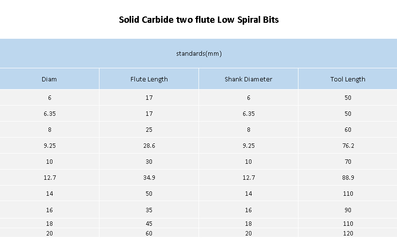 Solid Carbide two flute Low Spiral Bits